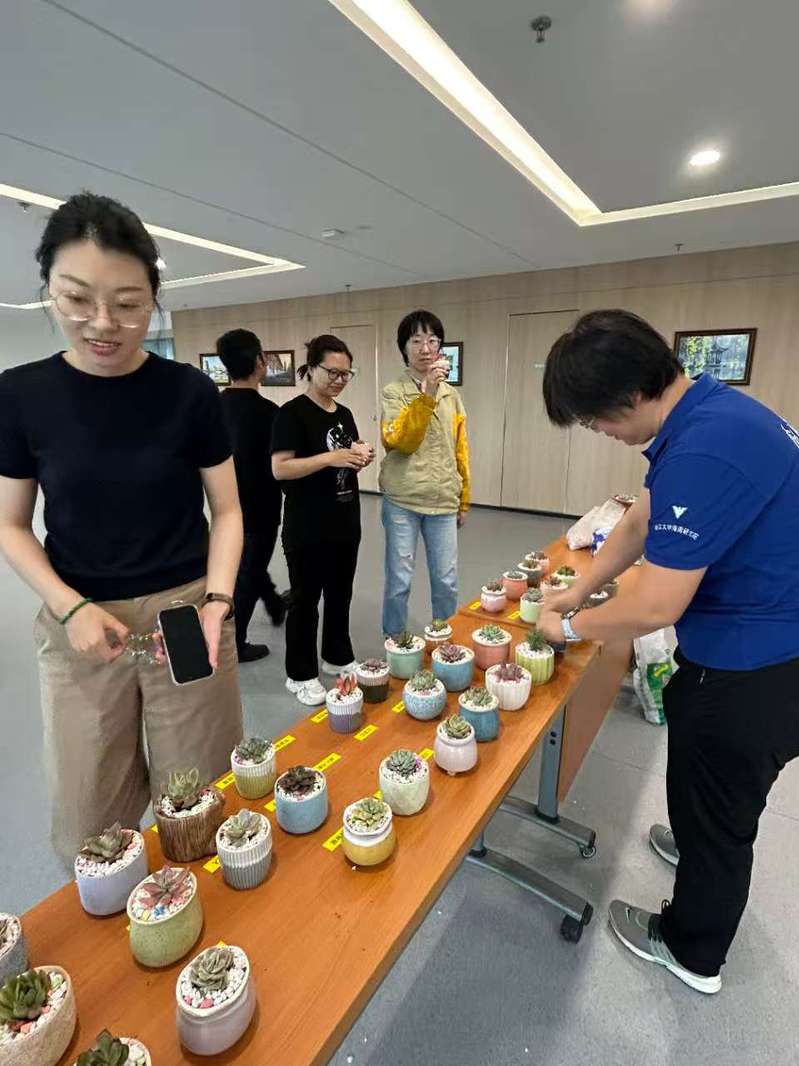 活动伊始,工作人员播放了讲解多肉植物的养护技巧视频——“选苗要选叶片饱满、无病虫害的;配土要用透气的颗粒土,避免积水;浇水要‘干透浇透’,不能频繁浇……”,让大家对多肉种植有了更清晰的认识。随后,大家纷纷动手实践:有的蹲在桌前挑选心仪的多肉,有的拿着花盆比对搭配,现场欢声笑语不断。“大家一边操作,一边互相交流技巧,有的帮同事扶着多肉幼苗,有的帮着调整花盆位置,不一会儿,一个个独一无二的多肉盆栽诞生了,大家捧着自己的作品,脸上洋溢着满足的笑容,纷纷拍照留念。