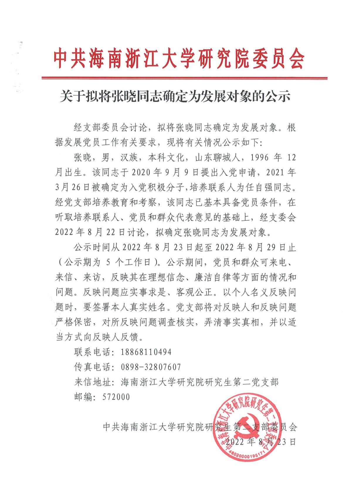 关于拟将张晓同志确定为发展对象的公示