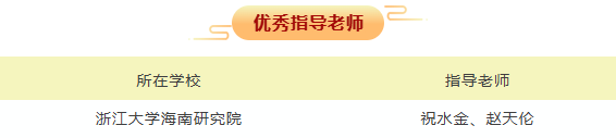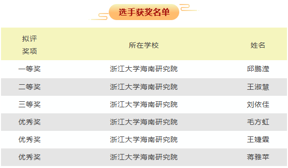 三亚崖州湾科技城高新区共有36名入驻院校研究生在本次决赛获奖(一等奖3名,二等奖4名,三等奖8名,优秀奖21名)。其中,浙江大学海南研究院研究生获一等奖1名、二等奖1名、三等奖1名、优秀奖3名,祝水金和赵天伦荣获优秀指导老师。